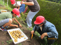 1・2年生は、劇「ゆりざるちゃんの大作戦~上林の野菜を守れ!の巻」を披露しました。地域の野菜づくり名人さんに教わりながら夏野菜を育てる中で、ハクビシンを捕まえた体験や学習をテーマにした劇でした。