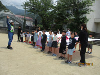 1〜6年生に見送られて学校を出発しました。途中で拝志小学校のみんなと合流して、目的地の久万スキーランドに到着しました。